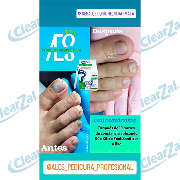 Kit Sistema Completo de ClearZal: consta de tres productos: El Gotero para uñas (BAC), un Spray desinfectante para pies (Foot Sanitiser) y una lima de uñas premium de cristal de cortesía para completar el Kit. Si bien el Gotero BAC está diseñado para eliminar todos los hongos, bacterias y virus que pueden causar infecciones en las uñas, el Spray desinfectante para pies ClearZal, al rociarse en los pies, calcetas y en el calzado, previene la propagación de la infección al resto de los pies y uñas, lo que podría causar pie de atleta.