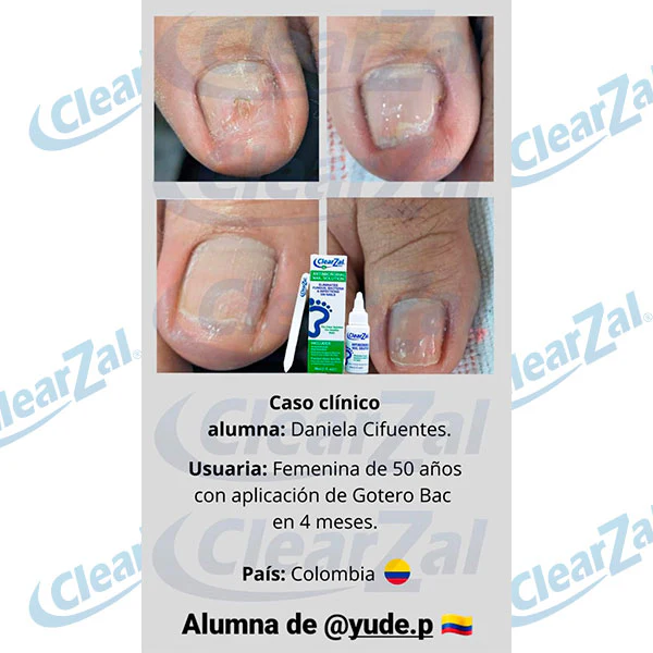 Gotero BAC: Lime el borde libre y la parte superior de la uña. Limpie la uña y la piel circundante y séquela bien. Aplique una gota de ClearZal BAC debajo del borde libre de la uña y la piel circundante. Deje secar la piel. Aplique ClearZal BAC dos veces al día alrededor de toda la uña y debajo del borde libre. Recuerde aplicarla antes de ponerse los zapatos y los calcetines, y al quitárselos. Spray Foot Sanitiser: Rocíe cada pie en la parte superior, inferior y entre los dedos una vez al día. Rocíe dentro de los zapatos antes de ponérselos y después de quitárselos. El rociador funciona al revés para facilitar su uso.