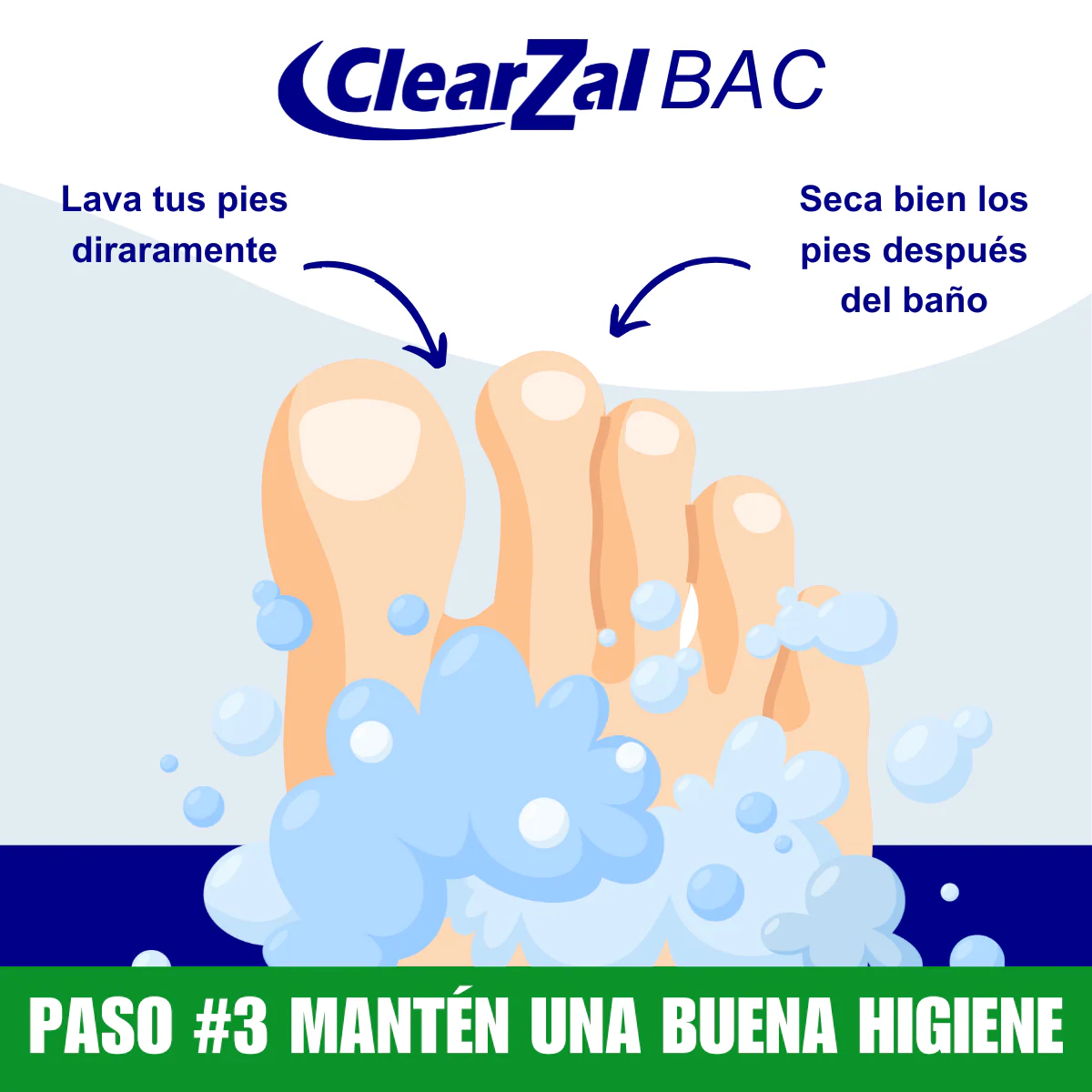 Gotero BAC: Lime el borde libre y la parte superior de la uña. Limpie la uña y la piel circundante y séquela bien. Aplique una gota de ClearZal BAC debajo del borde libre de la uña y la piel circundante. Deje secar la piel. Aplique ClearZal BAC dos veces al día alrededor de toda la uña y debajo del borde libre. Recuerde aplicarla antes de ponerse los zapatos y los calcetines, y al quitárselos. Spray Foot Sanitiser: Rocíe cada pie en la parte superior, inferior y entre los dedos una vez al día. Rocíe dentro de los zapatos antes de ponérselos y después de quitárselos. El rociador funciona al revés para facilitar su uso.